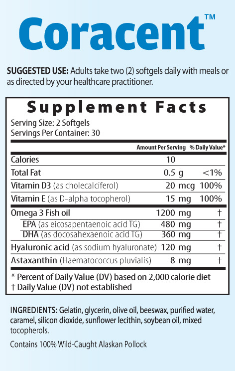 CORACENT® is a premium dietary supplement containing 100% wild caught and sustainable Alaskan fish oil, vitamin D3, vitamin E, astaxanthin, and hyaluronic acid. View Ingredients Panel